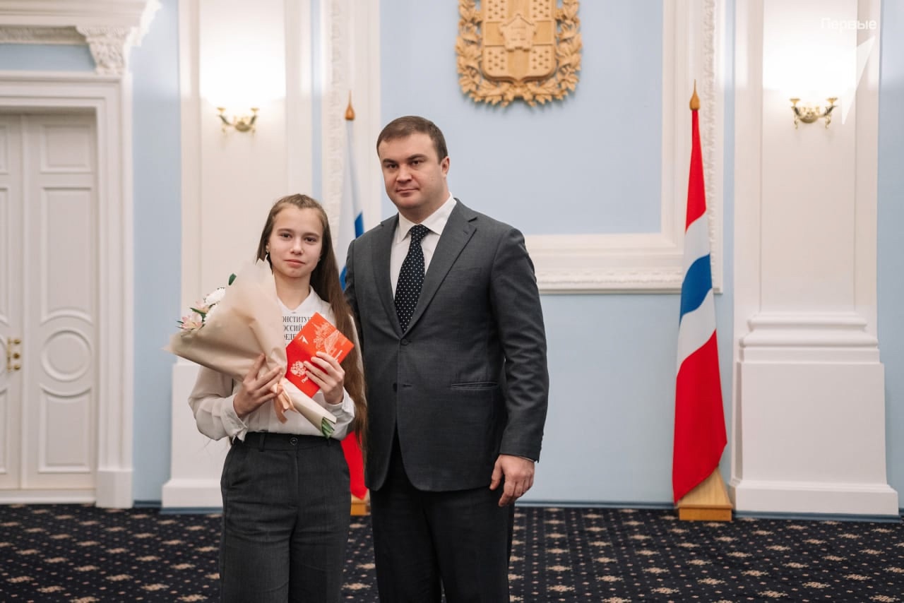 В этот же день паспорт из рук губернатора Омской области получила 14-летняя жительница села Кейзес Татьяна Серобабова. Чтобы попасть на такое торжество, она вместе с учителями подала заявку на участие в проекте «Мы – граждане России» в рамках «Движения первых», в котором рассказала о тех конкурсах и олимпиадах, в которых добилась весомых результатов.