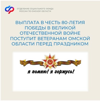 Согласно указу Президента, подписанному в связи с празднованием 80-й годовщины Дня Победы, выплату в размере 80 тысяч рублей Отделение Социального фонда России по Омской области направит участникам и инвалидам Великой Отечественной войны, их вдовам, а также омичам, награжденным знаком «Жителю блокадного Ленинграда». Выплата в этом размере также будет перечислена бывшим несовершеннолетним узникам концлагерей.