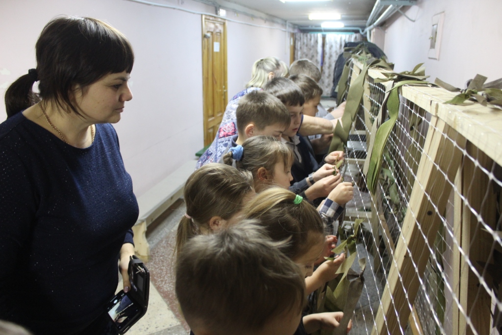 После этого ученики попали в кладовую, в которой лежат комплектующие материалы, а затем попробовали свои силы в работе: они выполнили надрезы на ленточках, а затем вплели их в маскировочную сеть. Ребята также познакомились со всей продукцией, которую производят добровольцы, а костюм «Лешего» многие примерили на себя.