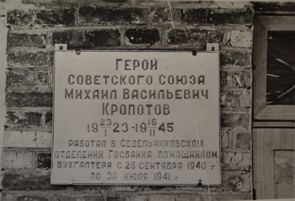 Мемориальная доска на бывшем здании Госбанка. Ныне не сохранилась. Фото из фондов районного музея истории