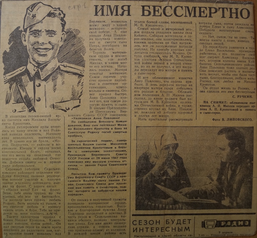 Публикация в газете о Михаиле Кропотове и передаче его матери документов о гибели сына