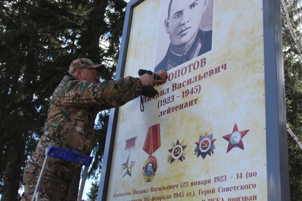 Напомним, именно от Евгения Тимофеевича пошла инициатива об увековечении подвига нашего земляка. Причем, не в виде мемориальной доски, а виде полноценной стелы, на которой был бы портрет Михаила Кропотова, его наградной ряд и послужной список. К этому перечню сегодня добавлен QR-код, отсканировав который, можно прочитать статью о его жизни и участии в Великой Отечественной войне.