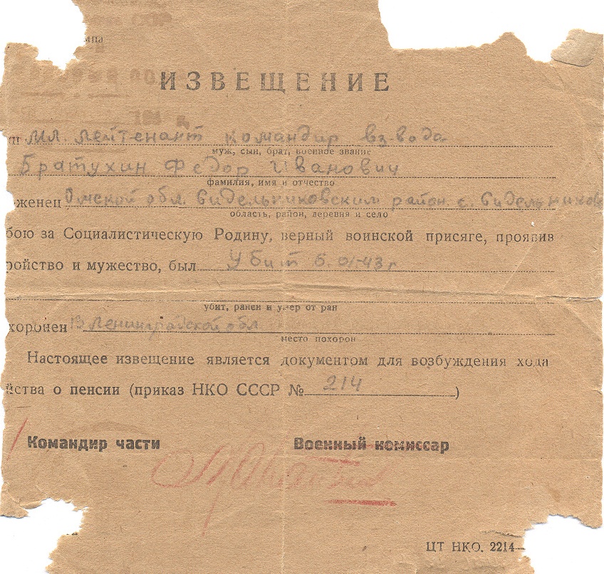 Здесь же было найдено и извещение о гибели офицера с текстом: «Младший лейтенант, командир взвода Братухин Федор Иванович, уроженец Омской области, Седельниковского района, с. Седельниково, в бою за Социалистическую Родину, верный воинской присяге, проявив геройство и мужество, был убит 6 января 1943 года. Похоронен в Ленинградской области. Настоящее извещение является документом для возбуждения ходатайства о пенсии (Приказ НКО СССР № 214)».