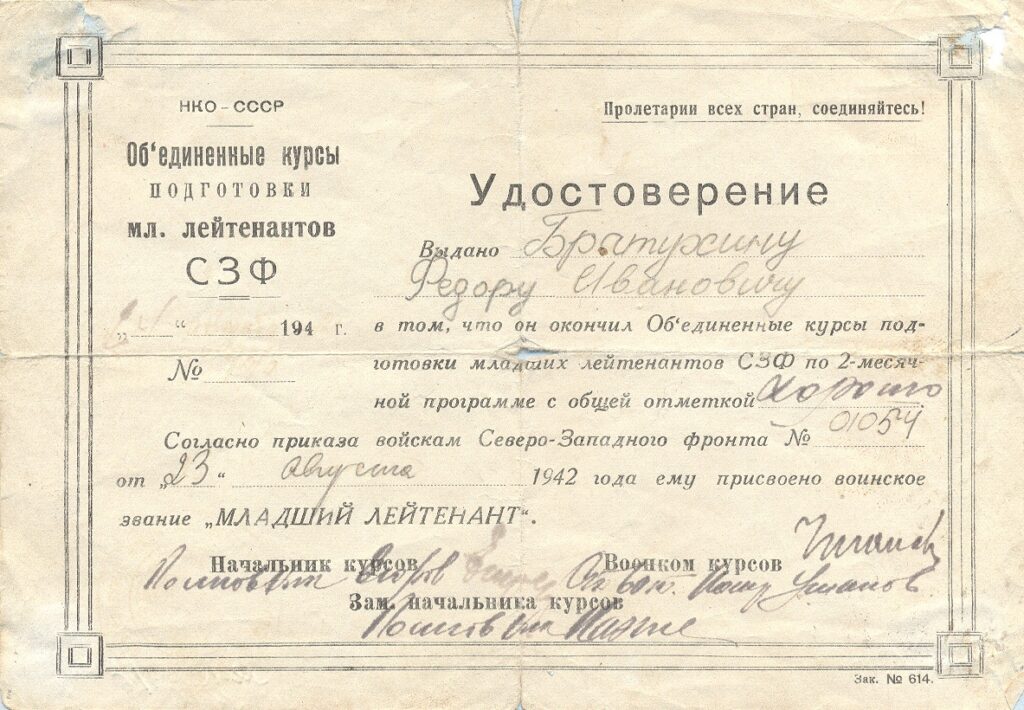 Началась проработка материалов, что сохранились на местном уровне. Так в районном музее истории было обнаружено удостоверение, выданное Братухину Федору Ивановичу в том, что он окончил объединенные курсы подготовки младших лейтенантов Северо-Западного фронта по двухмесячной программе с общей отметкой «хорошо». Согласно приказу по войскам Северо-Западного фронта №01054 от 23 августа 1942 года ему было присвоено воинское звание «младший лейтенант».
