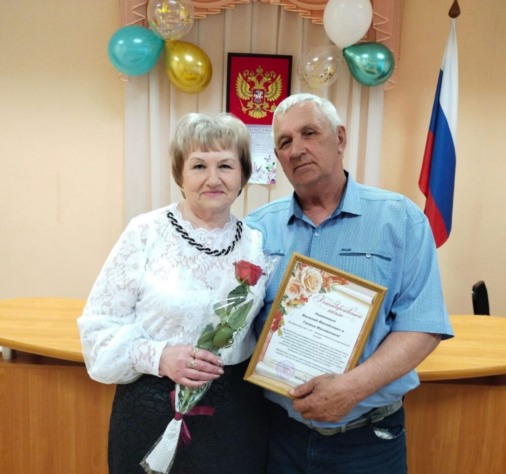 Юбиляры приняли поздравления от заместителя главы района Елены Поплавской. Она пожелала им продолжать жить в мире, любви и согласии, а также прочитала стихотворение Эдуарда Асадова «Слово о любви». Солисты досугового центра «Светоч» Наталья Шамшур и Екатерина Жойдик подарили юбилярам душевные песни о любви.