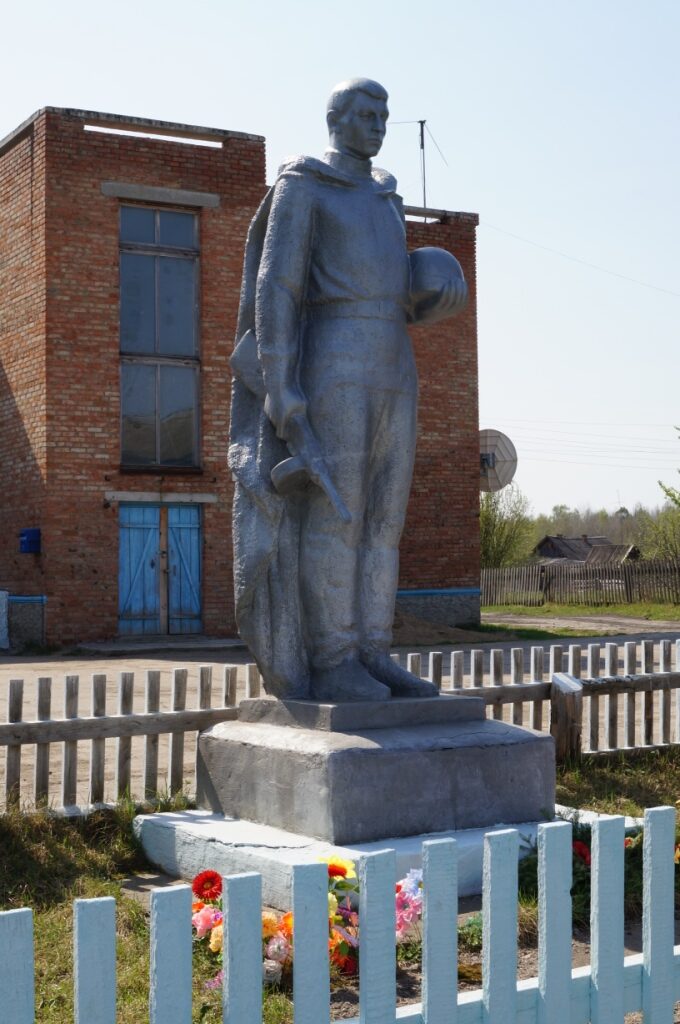 Что из себя представляет данный памятник? Это солдат советской армии в военной форме, который в правой руке держит автомат ППШ, опущенный стволом вниз, а в левой, согнутой в локте, – каску. Солдат словно застыл в минуте молчания и отдает дань памяти тем, кто не вернулся с полей сражений. Высота солдата около 280 см. Установлена фигура на трехступенчатую тумбу. Размер нижней ступени 170 на 180 сантиметров, ее высота – 20 сантиметров. Вторая ступень размерами 120 на 115 и высотой в 40 сантиметров. Третья ступень, она же основание памятника, имеет размеры 80 на 80 сантиметров и высотой около 12 сантиметров.
