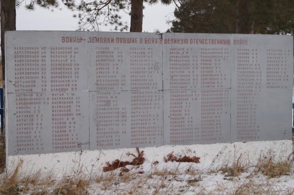 На лицевой стороне стелы вверху выгравировано лицо солдата в каске, устремленное вперед. Ниже цифры: «1941-1945». Высота стелы – 4 метра, ширина – 1 метр, толщина – 55 сантиметров. Рядом – большой щит с восьмью гранитными плитами, на которых под общим заголовком «Воины-земляки, павшие в боях в Великой Отечественной войне», выгравированы фамилии тех, кто не вернулся с фронта. Высота плиты – 1,74 метра, длина – 4 метра, толщина – 42 сантиметра. Мемориал огорожен деревянным штакетником, а вокруг него посажены хвойные деревья.
