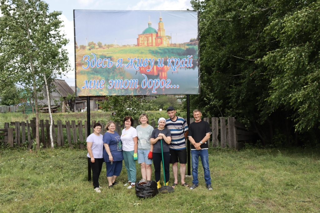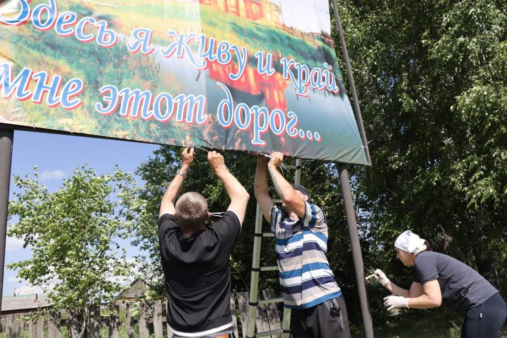 Только после наведения порядка инициативная группа приступила к монтажу на установленном здесь каркасе напечатанного ко Дню села Седельниково баннера.