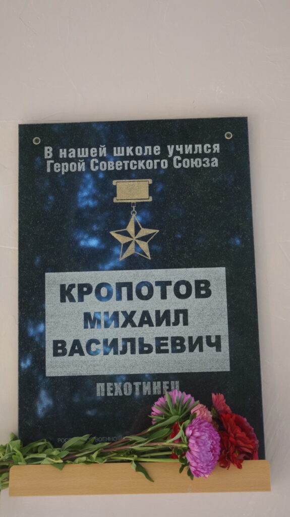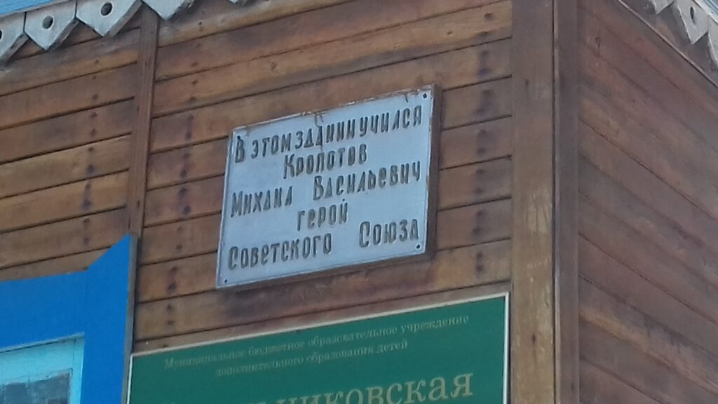 В 2017 году в деревне Богдановка я со своими воспитанниками и неравнодушными односельчанами начал возрождать дом, где родился и жил Михаил Васильевич Кропотов. С 2009 года изба стояла в запустении, в ней никто не жил, все заросло бурьяном и крапивой. Как за 3 месяца нам удалось преобразить это место, читайте далее – в главе, посвященной ветеранам из деревень Богдановка и Тереуль. Здесь лишь скажу о том, что весной 2019 года по инициативе моего лучшего друга, коллеги, поисковика из Кейзеса Сергея Александровича Плехова был разработан и отпечатан в Омске баннер, посвященный Герою Советского Союза Михаилу Васильевичу Кропотову, который мы разместили накануне 9 мая 2019 года на его доме. На нем – крупный портрет, награды погибшего офицера и выдержка из посмертного представления к званию Героя Советского Союза.