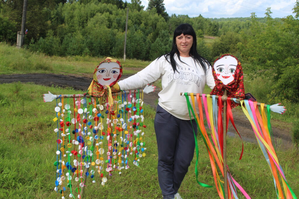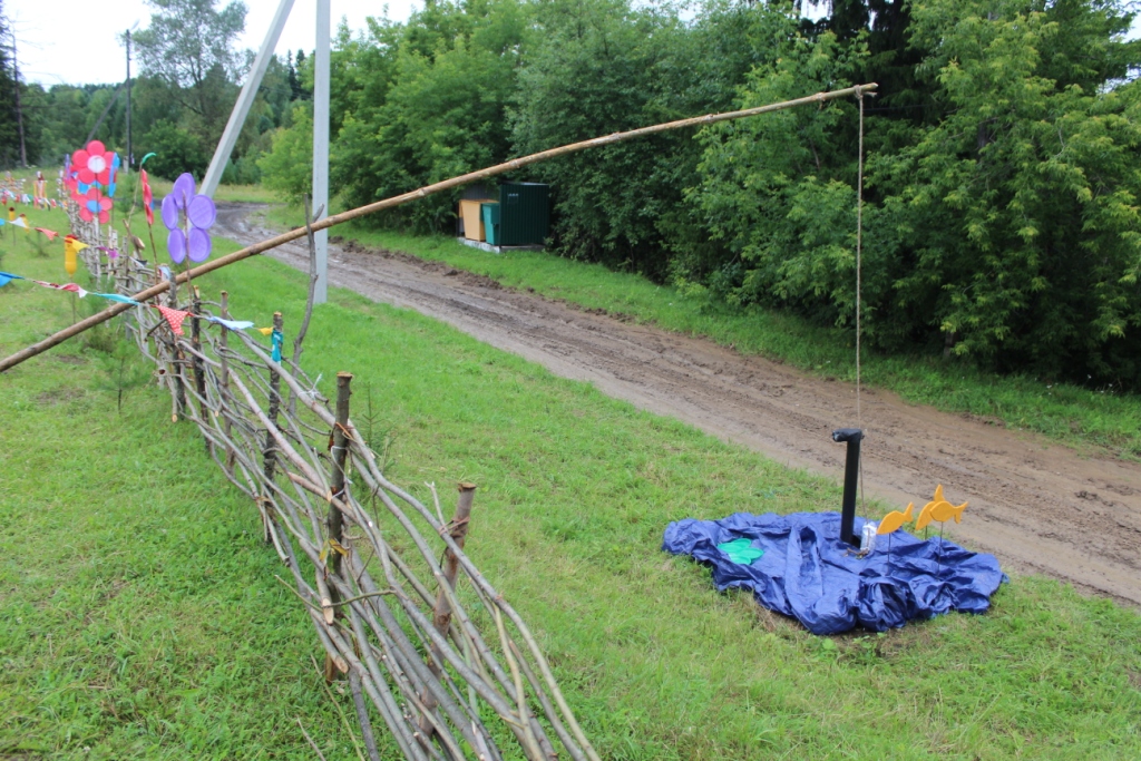 С поляны на мимо проходящую дорогу организаторы праздника закинули огромную удочку, а у дороги соорудили искусственный пруд с рыбами и выглядывающим из воды перископом подводной лодки. Для поделок из бересты местной хранительницы ремесел Елены Турковой из досок были возведены две стены избы.
