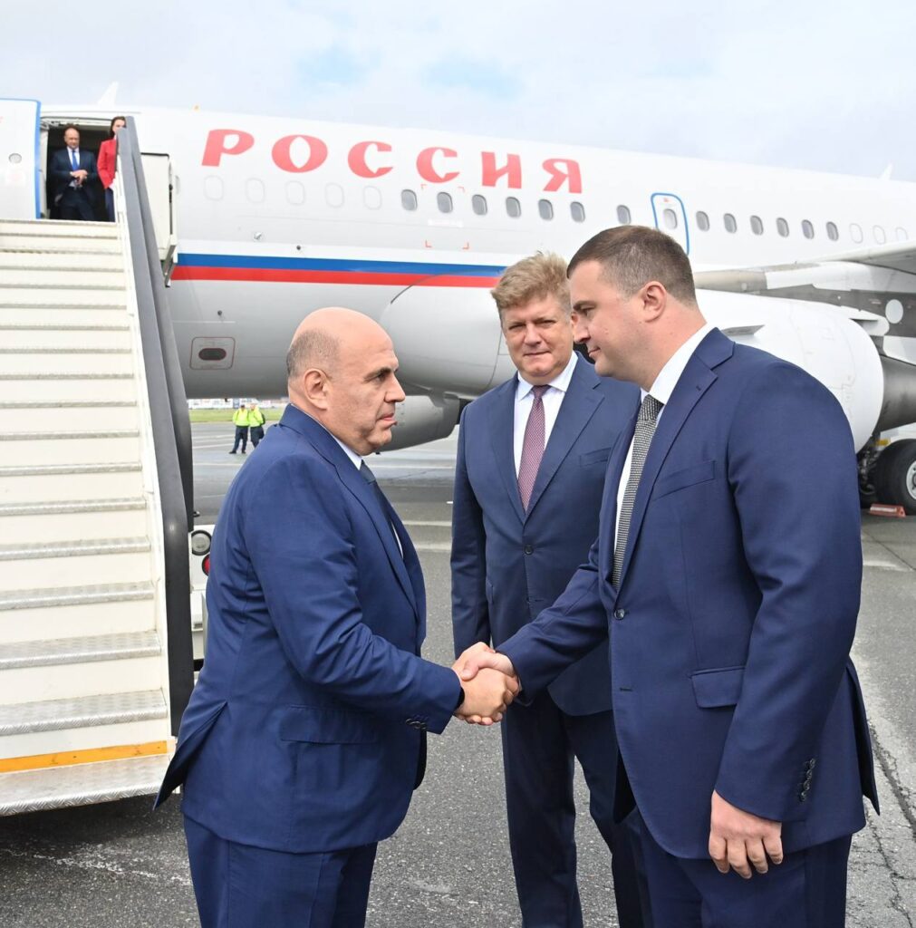 Председателя Правительства РФ у трапа самолёта встретили Губернатор Омской области Виталий Хоценко и полномочный представитель Президента Российской Федерации в Сибирском федеральном округе Анатолий Серышев.