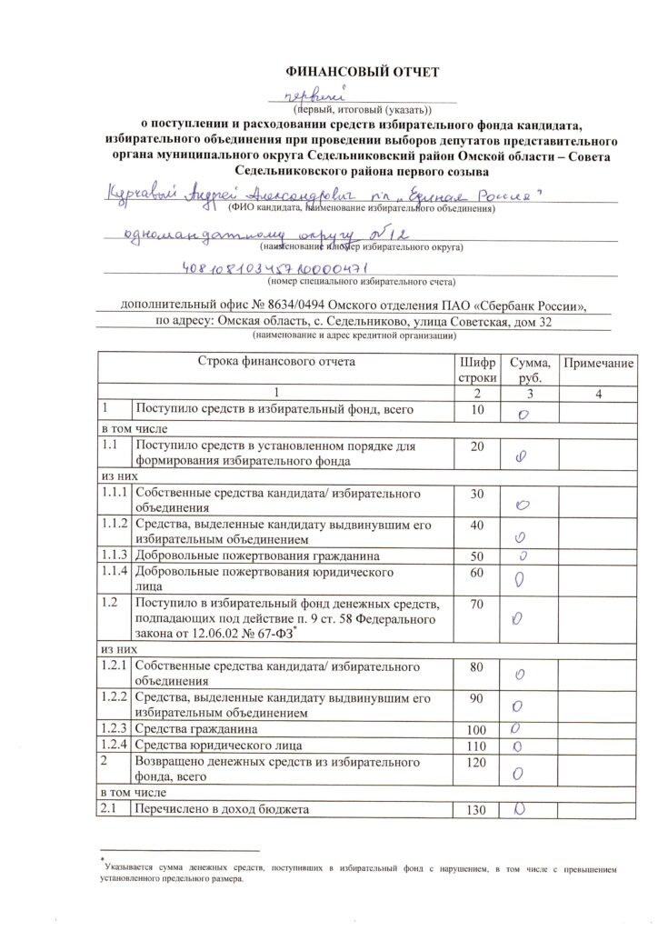 Мы публикуем финансовый отчет о поступлении и расходовании средств избирательного фонда кандидата Курчавого Андрея Александровича по избирательному округу №12