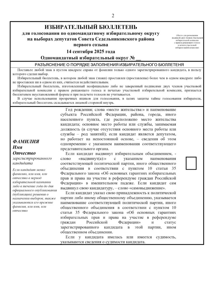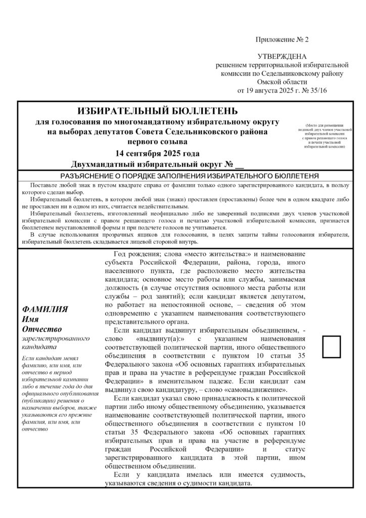 Решение № 35/16 от 19 августа 2025 года с. Седельниково «О форме избирательного бюллетеня для голосования на выборах депутатов Совета Седельниковского района первого созыва»