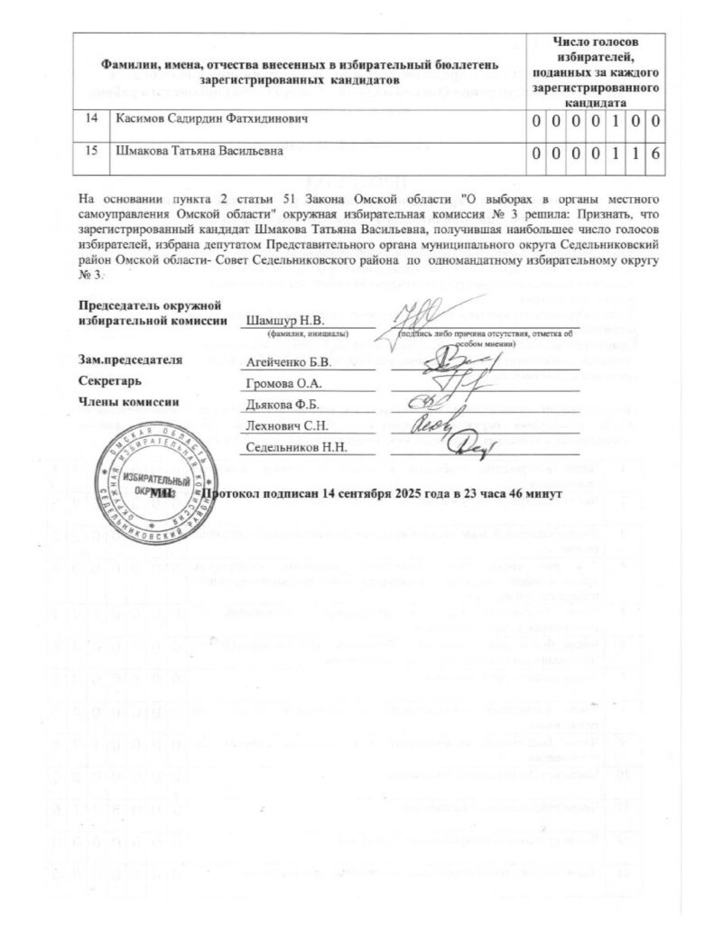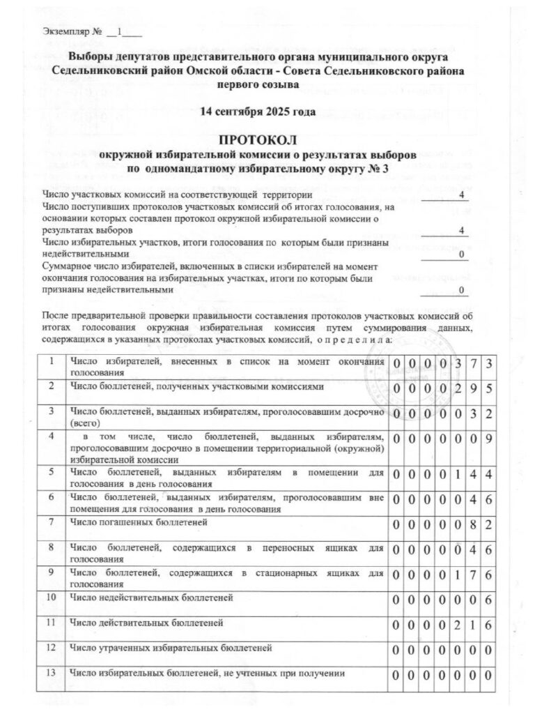 На основании данных первых экземпляров протоколов об итогах голосования, полученных из участковых избирательных комиссий, протокола о результатах выборов депутата Совета Седельниковского района первого созыва по одномандатному избирательному округу №3 территориальной избирательной комиссии по Седельниковскому району Омской области, организующей подготовку и проведение выборов депутатов Совета Седельниковского района первого созыва, с полномочиями окружной избирательной комиссии одномандатного избирательного округа №3, в соответствии со статьями 8, 70 Федерального закона «Об основных гарантиях избирательных прав и права на участие в референдуме граждан Российской Федерации», статьями 13, 51 Закона Омской области «О выборах в органы местного самоуправления Омской области», окружная избирательная комиссия решила: