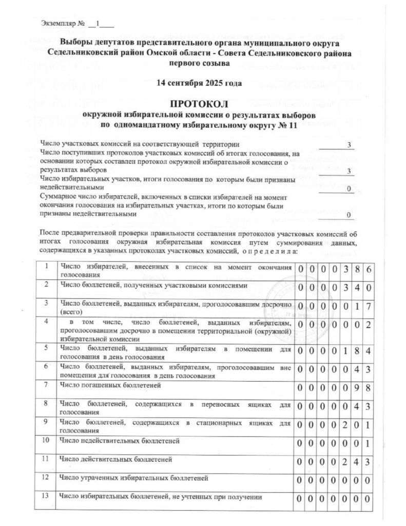 На основании данных первых экземпляров протоколов об итогах голосования, полученных из участковых избирательных комиссий, протокола о результатах выборов депутата Совета Седельниковского района первого созыва по одномандатному избирательному округу №11 территориальной избирательной комиссии по Седельниковскому району Омской области, организующей подготовку и проведение выборов депутатов Совета Седельниковского района первого созыва, с полномочиями окружной избирательной комиссии одномандатного избирательного округа №11, в соответствии со статьями 8, 70 Федерального закона «Об основных гарантиях избирательных прав и права на участие в референдуме граждан Российской Федерации», статьями 13, 51 Закона Омской области «О выборах в органы местного самоуправления Омской области», окружная избирательная комиссия решила: