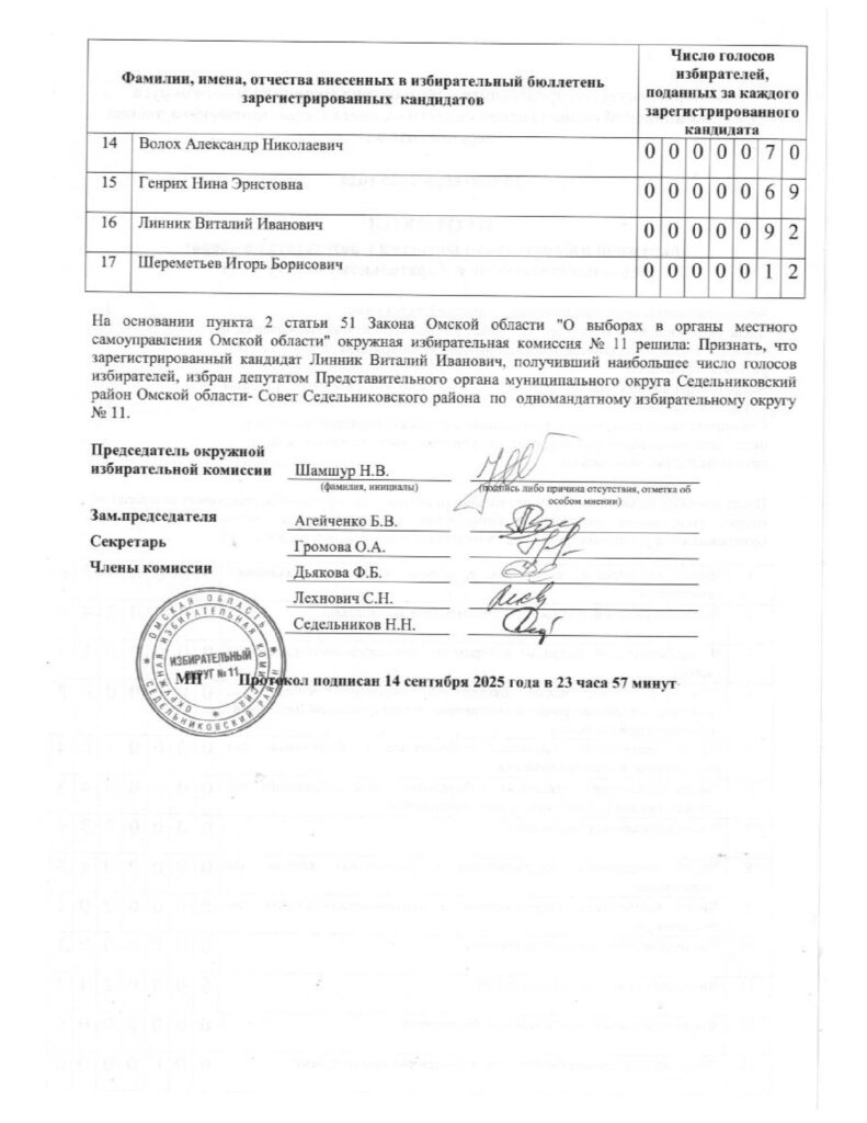 2. Считать избранным депутатом Совета Седельниковского района первого созыва по одномандатному избирательному округу №11 Линник Виталия Ивановича, получившего 92 голоса избирателей, что является наибольшим числом голосов избирателей, принявших участие в голосовании, по отношению к другим кандидатам.