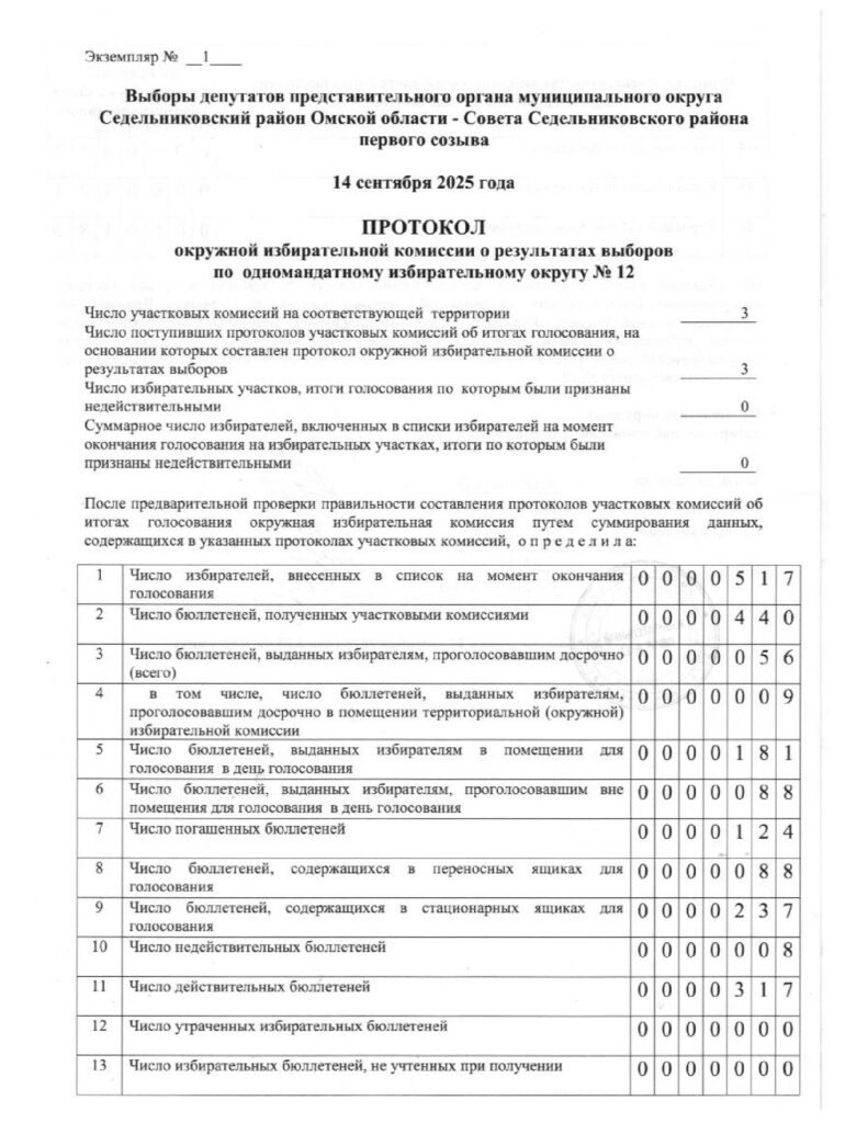 На основании данных первых экземпляров протоколов об итогах голосования, полученных из участковых избирательных комиссий, протокола о результатах выборов депутата Совета Седельниковского района первого созыва по одномандатному избирательному округу № 12 территориальной избирательной комиссии по Седельниковскому району Омской области, организующей подготовку и проведение выборов депутатов Совета Седельниковского района первого созыва, с полномочиями окружной избирательной комиссии одномандатного избирательного округа № 12, в соответствии со статьями 8, 70 Федерального закона «Об основных гарантиях избирательных прав и права на участие в референдуме граждан Российской Федерации», статьями 13, 51 Закона Омской области «О выборах в органы местного самоуправления Омской области», окружная избирательная комиссия решила: