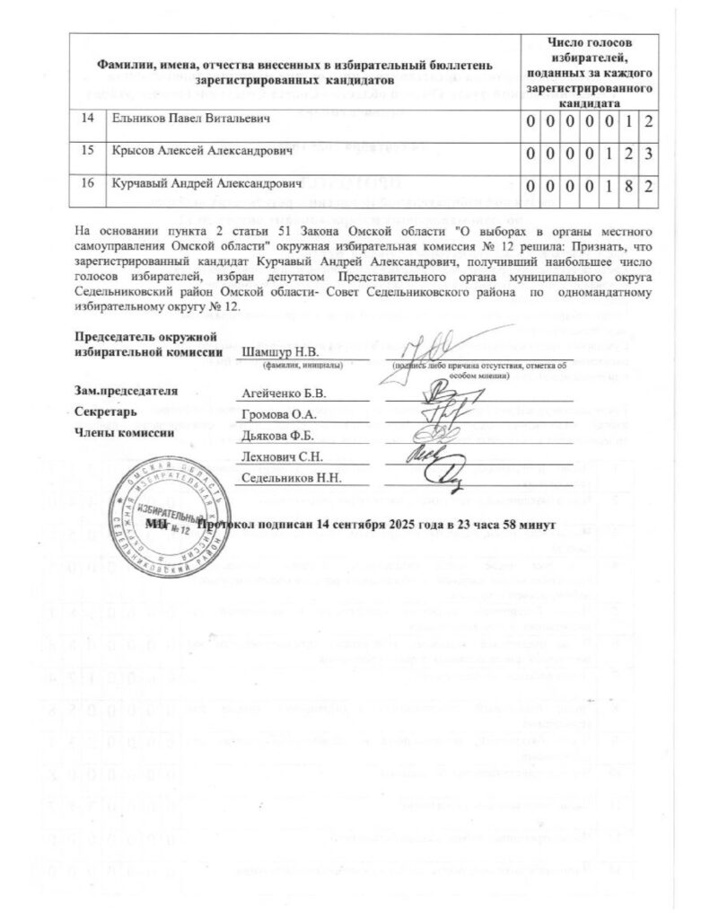 2. Считать избранным депутатом Совета Седельниковского района первого созыва по одномандатному избирательному округу №12 Курчавого Андрея Александровича, получившего 182 голоса избирателей, что является наибольшим числом голосов избирателей, принявших участие в голосовании, по отношению к другим кандидатам.