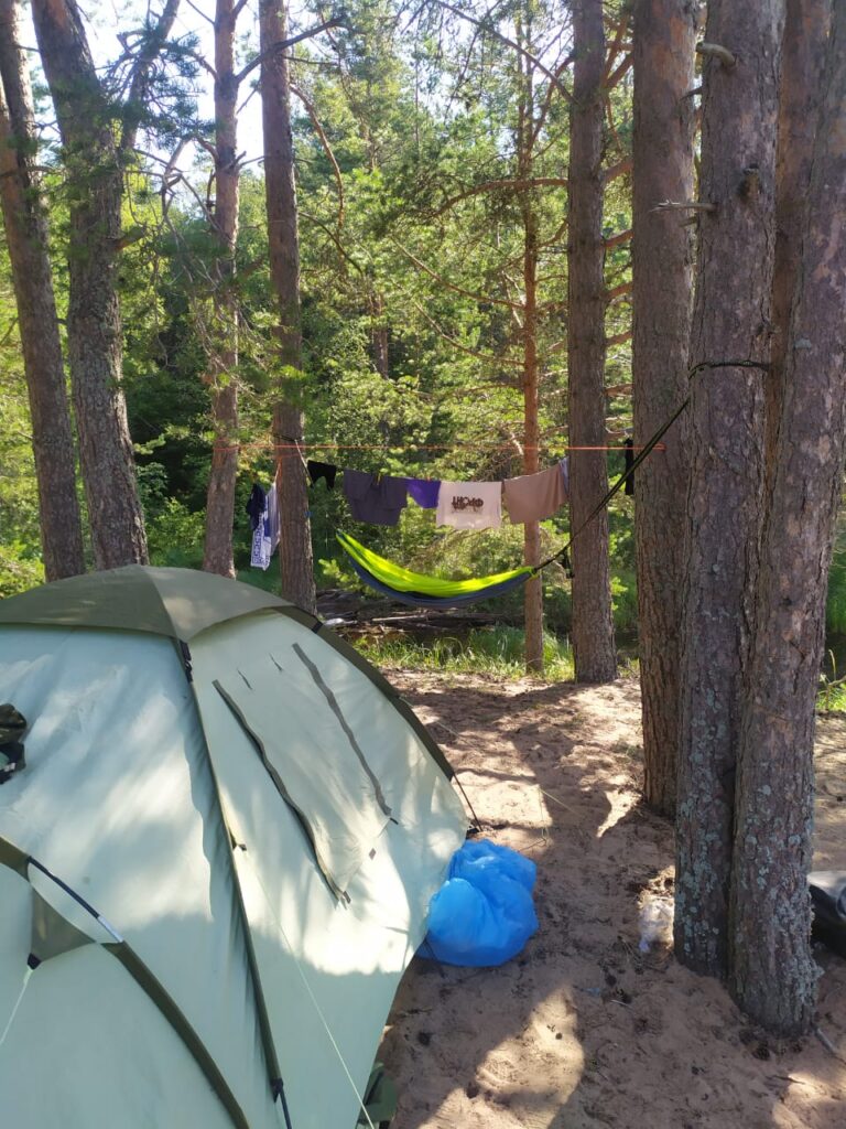 Времени на отдых не было, но увидев красоту Ладожского озера, первым делом решили окунуться в его водах, некоторые сделали это не снимая одежды. Вода оказалась прохладной, так как еще не успела прогреться после предшествующих нашему приезду дождей. После водных процедур распланировали лагерь, поставили пять палаток и натянули тент для будущей столовой, чтобы на случай дождя было место, куда спрятать отрядное имущество. Чаем нас угостили коллеги из Кузбасса, а дежурные на их костре приготовили ужин. Кушали уже в сумерках, расположившись на выделенных для хозяйственных нужд горбылях.