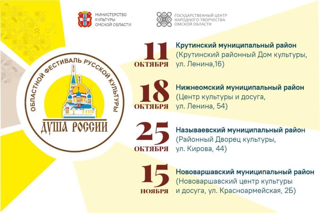 В октябре и ноябре 2025 года в Омской области пройдет заключительный этап XIV областного фестиваля русской культуры «Душа России». Программа проекта включает в себя культурные мероприятия в районных центрах четырех творческих зон. Особенностью этих мероприятий будет то, что каждая зональная концертная программа будет посвящена разным темам.