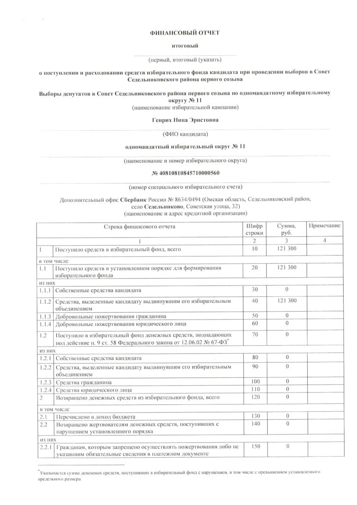 Мы публикуем финансовый отчет о поступлении и расходовании средств избирательного фонда кандидата Генрих Нины Эрнстовны по избирательному округу №11
