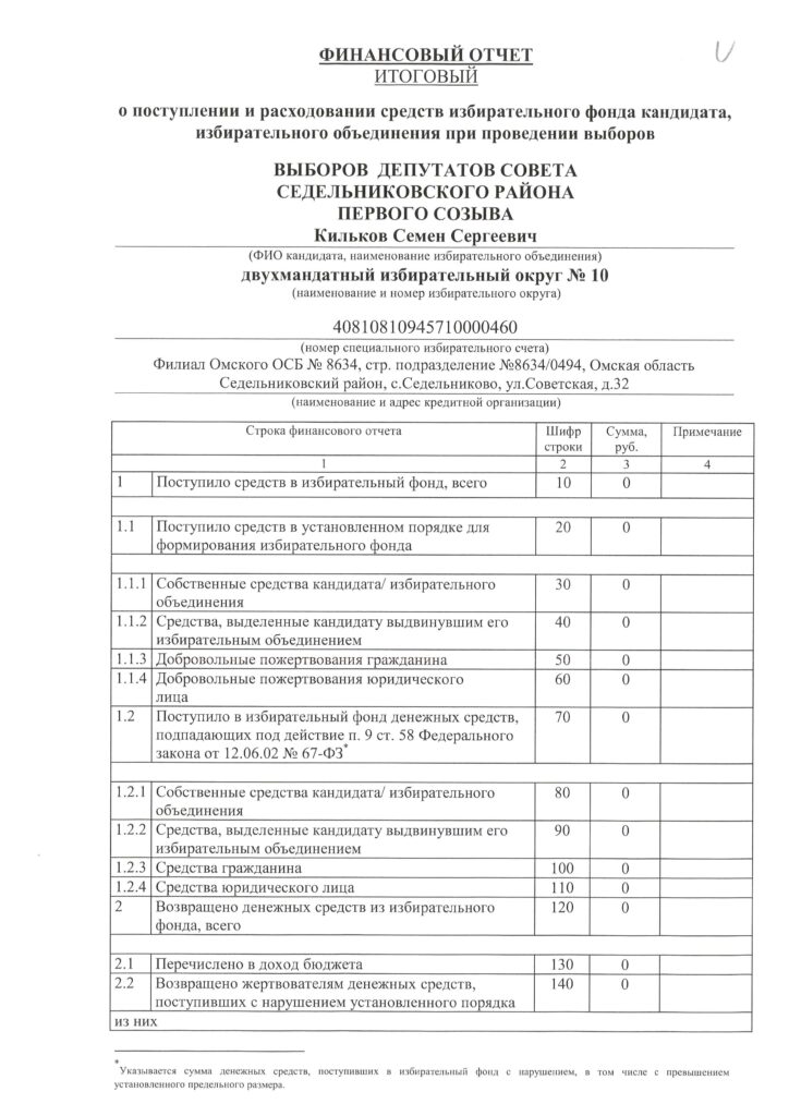 Мы публикуем финансовый отчет о поступлении и расходовании средств избирательного фонда кандидата Килькова Семена Сергеевича по избирательному округу №10