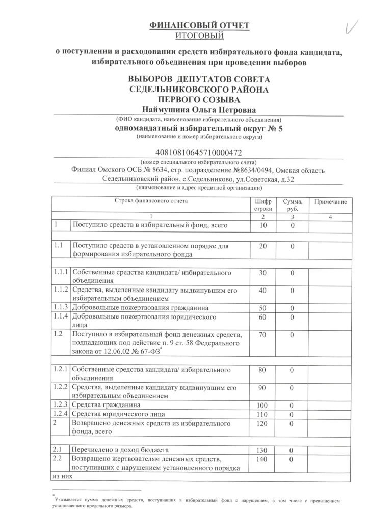 Мы публикуем финансовый отчет о поступлении и расходовании средств избирательного фонда кандидата Наймушиной Ольги Петровны по избирательному округу №5