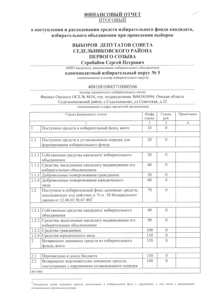 Мы публикуем финансовый отчет о поступлении и расходовании средств избирательного фонда кандидата Серобабова Сергея Петровича по избирательному округу №5