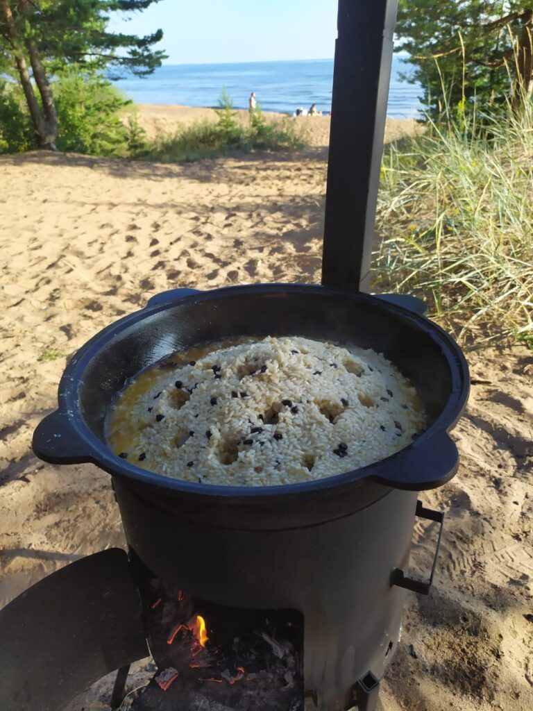 На ужин нас уже ждал плов, приготовленный по всем правилам, в казане. Почетным гостем была Марина Владимировна – руководитель экспедиции. Вечером у костра пели песни под аккомпанемент гитары Андрея Смелякова.