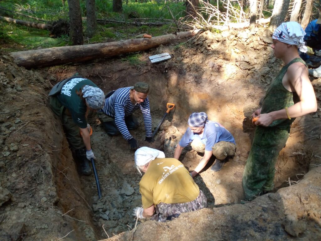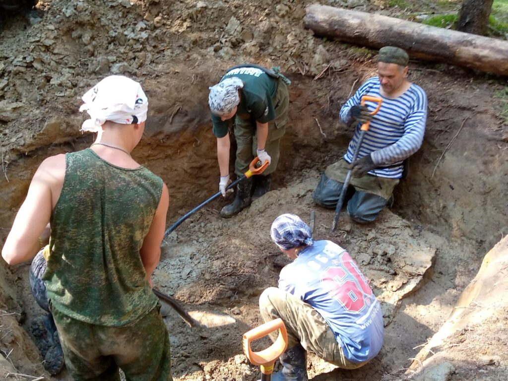 После обеда, парни приступили к рекультивации раскопа, а мы со Стасом отправились в разведку. В этот раз решили исследовать территорию вдоль раскопов и попытаться найти финскую каску, которую оставили, по рассказам, на пеньке весной местные поисковики. Но то ли мы неправильно выбрали направление, то ли кто-то из коллег нашел ее раньше нас и забрал в качестве утешительного приза, мы опять вернулись ни с чем… Большинство коллег тоже. Только у поисковиков из Кузбасса, поднявших красноармейца с медальоном у дороги, находки не прекратились. Они расширили раскоп в надежде найти еще одного бойца.