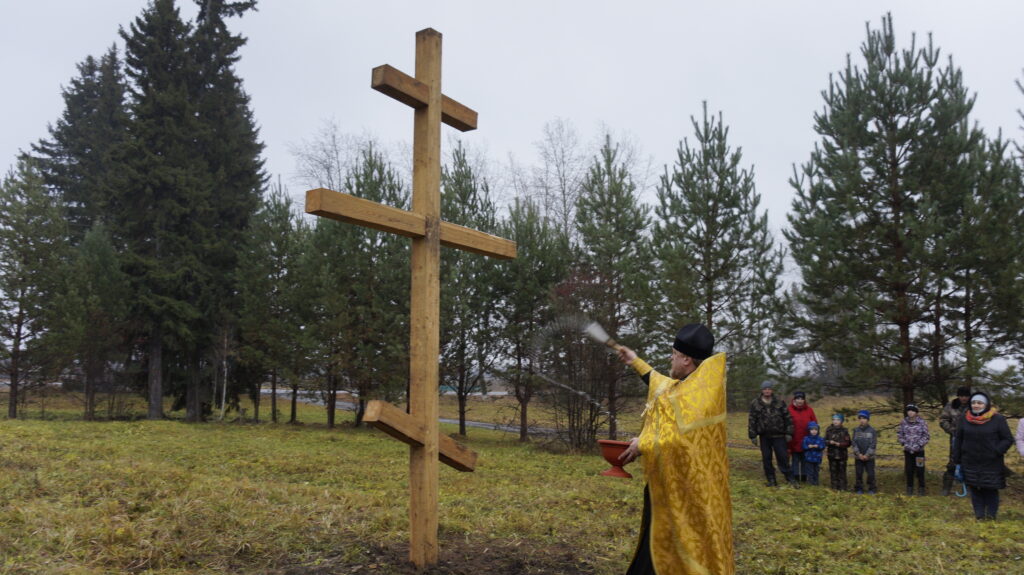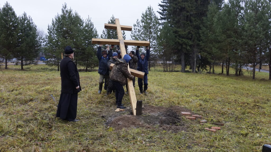 Утро. 23 октября 2021 года. На улице совсем неуютно: пасмурно, сыро, с неба сыплет нудный моросящий дождик, температура – чуть выше нуля. А на месте бывшего храма идет сборка креста, который возвестит о новом этапе в возрождении веры в селе Кукарка. Глава поселения Игорь Трегубов и директор основной школы Геннадий Тимошевский ведут его сборку: на продольный брус укладывают поперечные детали и, как и их предки, собирают крест на деревянные шканты – делают все без единого гвоздя.
