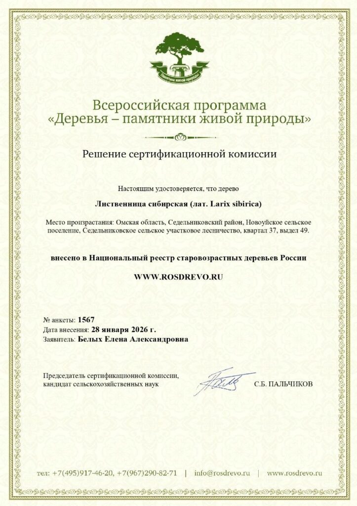 После этого я обратились в отдел Седельниковское лесничество, в котором я получила номер квартала, где растет лиственница. Когда все было готово, составлены описание и обоснование, 15 ноября 2025 года подала заявку в федеральную комиссию в Москву. А уже 28 января 2026 года пришла радостная весть – нашу лиственницу внесли в федеральный реестр. Теперь осталось дело за малым: облагородить место вокруг дерева, соорудить мостки через канаву и оформить рядом с лиственницей информационный стенд. Хотелось, чтобы седельниковцы и здесь оказали помощь, хотя бы с пиломатериалом для мостика через глубокий кювет. После 15 февраля все желающие смогут познакомиться с анкетой седельниковской лиственницы в Национальном реестре www.rosdrevo.ru, – рассказала «Сибирскому труженику» руководитель клуба «Истории в кедах», координатор проекта «ЭтноСлед – дорогами предков» и просто неравнодушный человек Елена Александровна Белых.